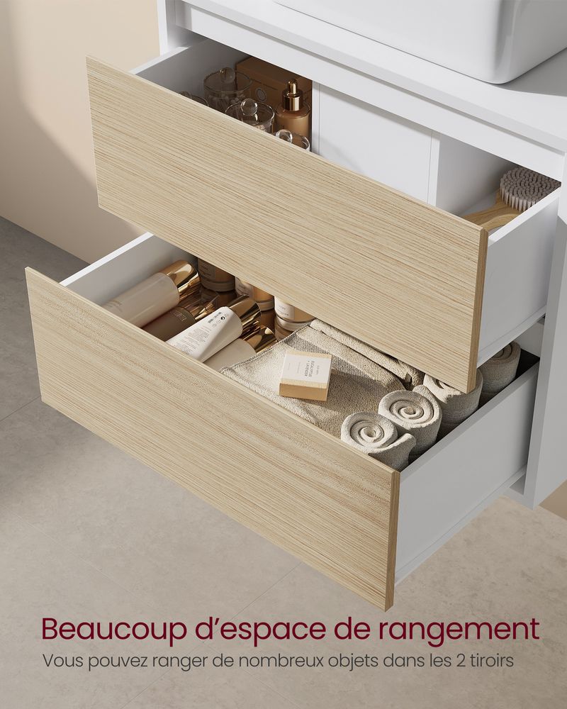 ✔ Rangement généreux – 2 tiroirs profonds pour garder vos accessoires de salle de bain bien organisés