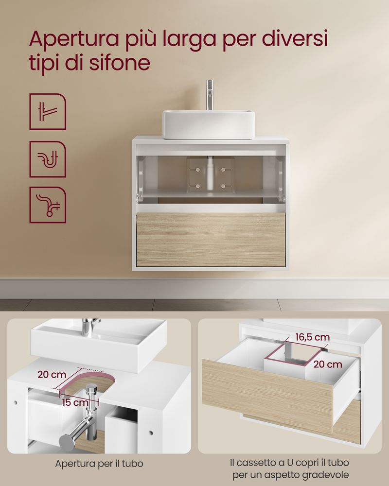 ✔ Compatible avec plusieurs types de siphons – Découpe de 20 x 15 cm (non compatible avec les lavabos colonne)