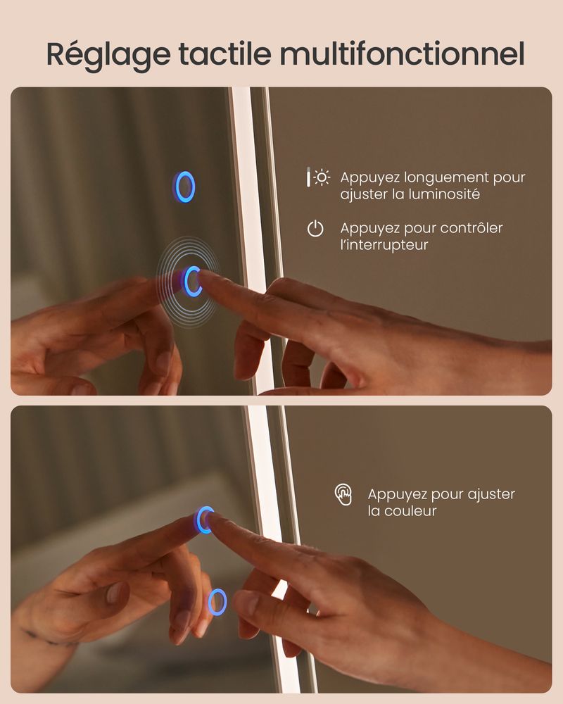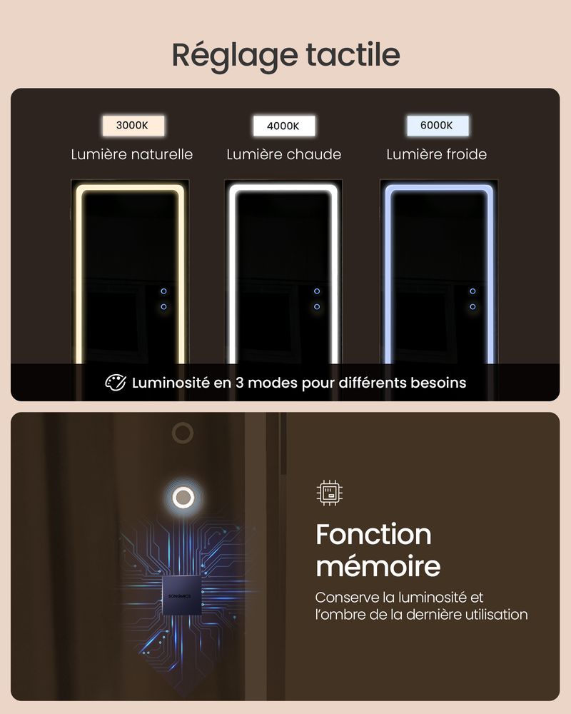 [Vue complète] Grande glace sur pied avec 3 niveaux de luminosité réglables et fonction mémoire, idéale pour une mise en beauté détaillée.