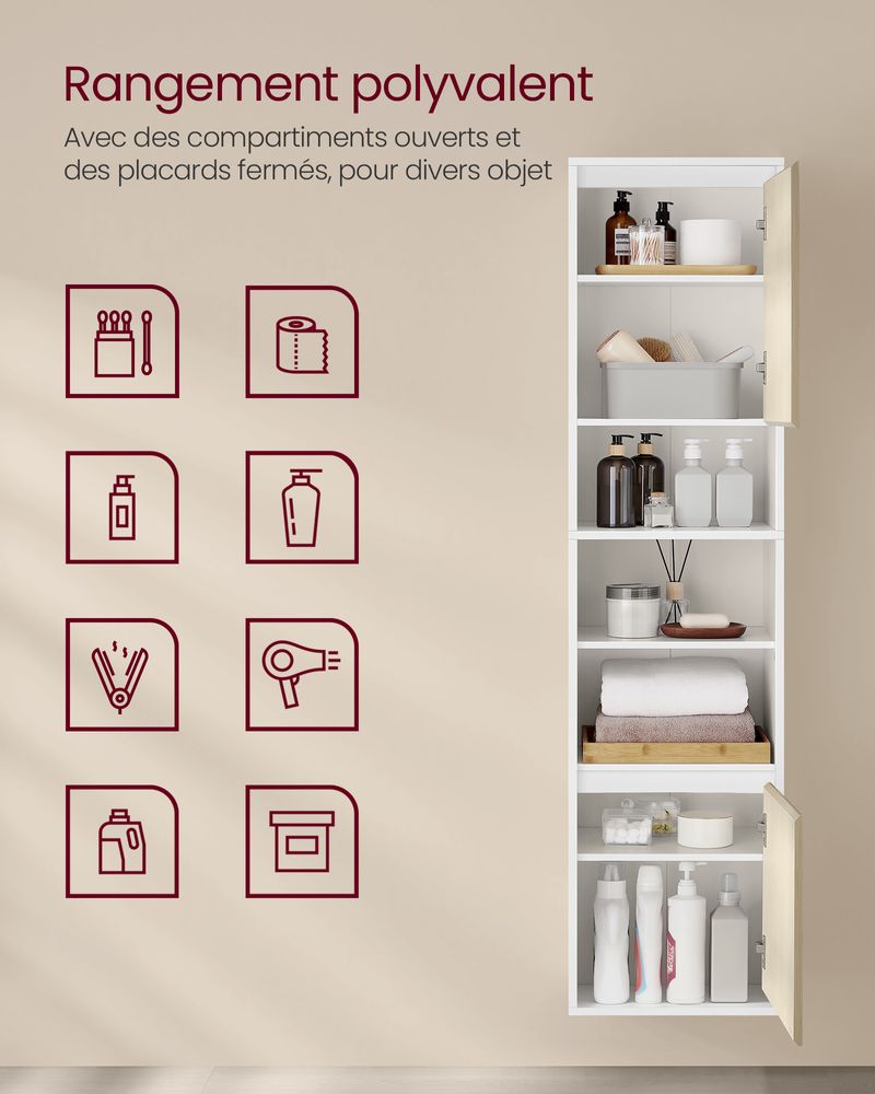 Armoire Murale pour Salle de Bain – Blanc & Beige Naturel – 30 x 40 x 160 cm