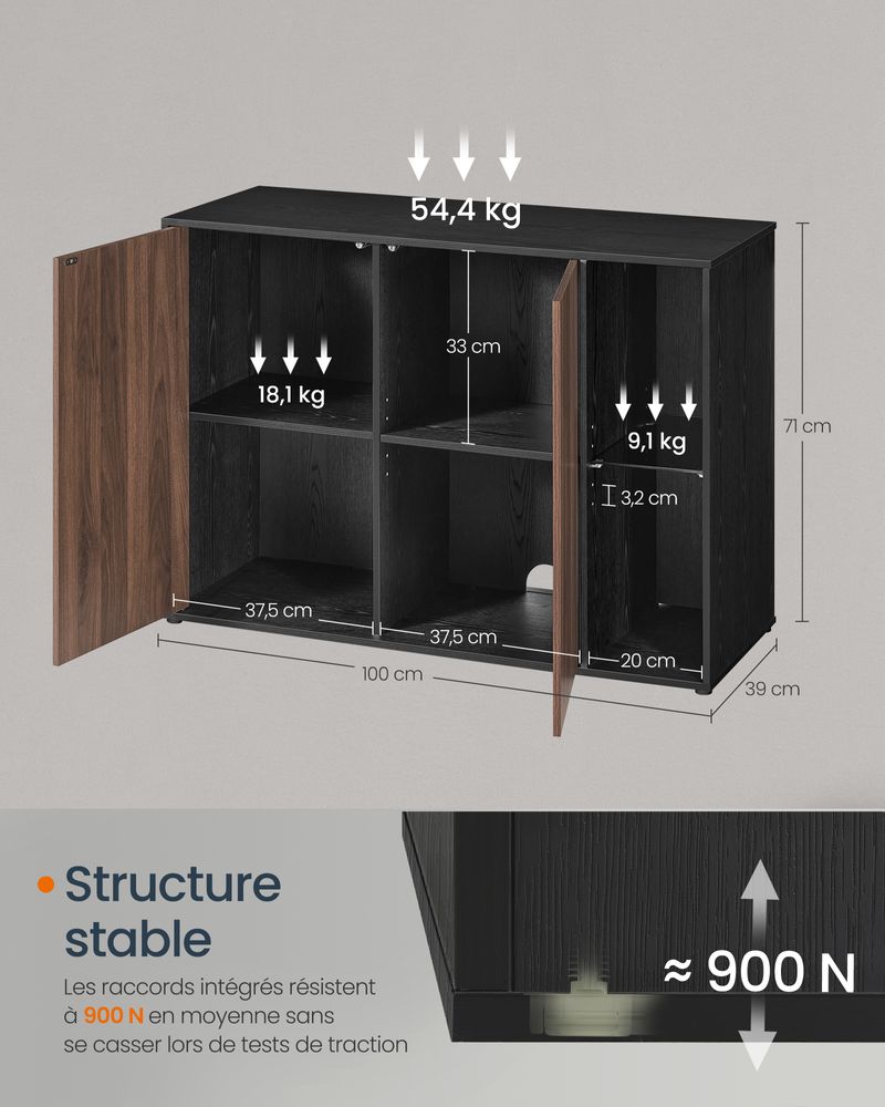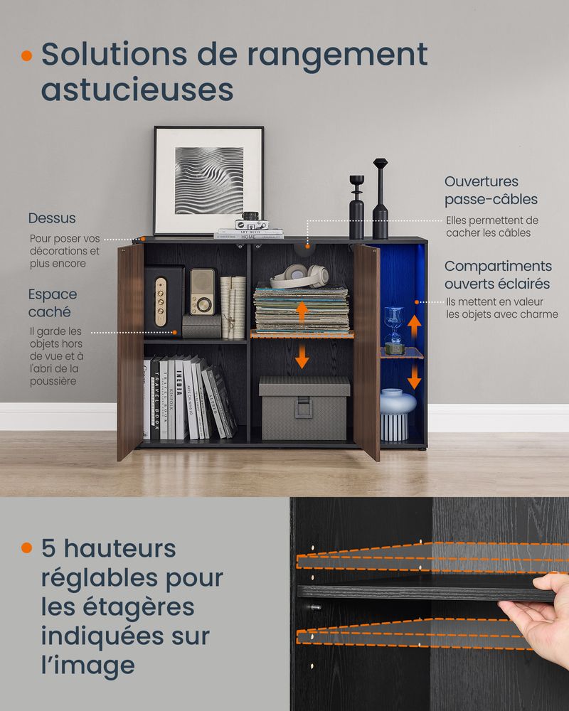 La tablette en verre et l’étagère droite derrière les portes sont réglables sur 5 niveaux pour un rangement personnalisé. Les passe-câbles intégrés assurent un espace bien ordonné.
