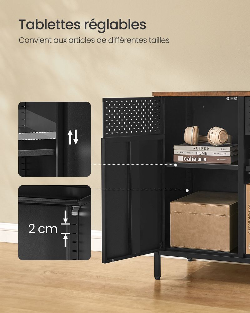 Utilisez-le comme buffet dans la cuisine, meuble TV dans le salon ou armoire de rangement au bureau. Avec son large plateau supérieur, son tiroir pour les petits objets, ses deux compartiments ouverts et ses étagères réglables, il offre un espace de rangement optimal. Son design industriel en brun vintage et noir mat apporte une touche moderne à tout intérieur.