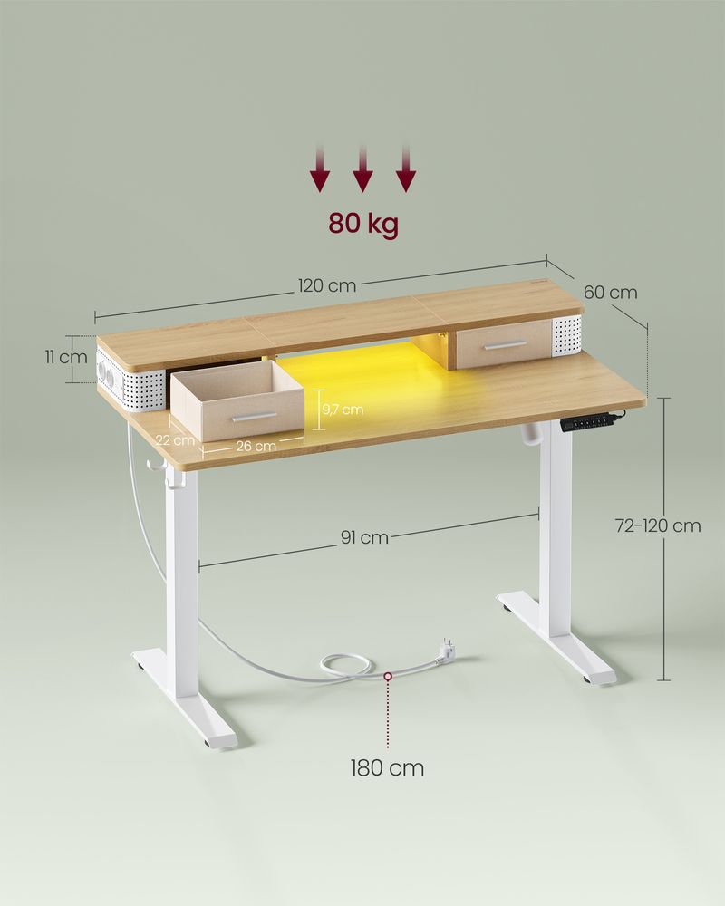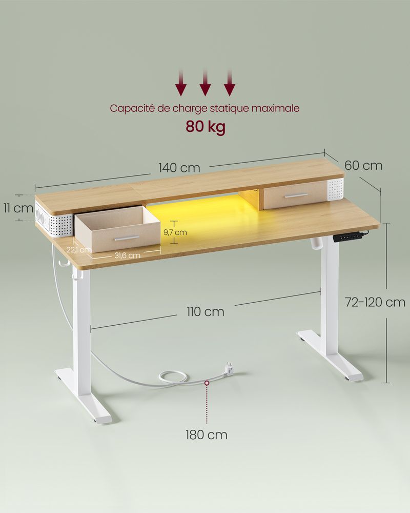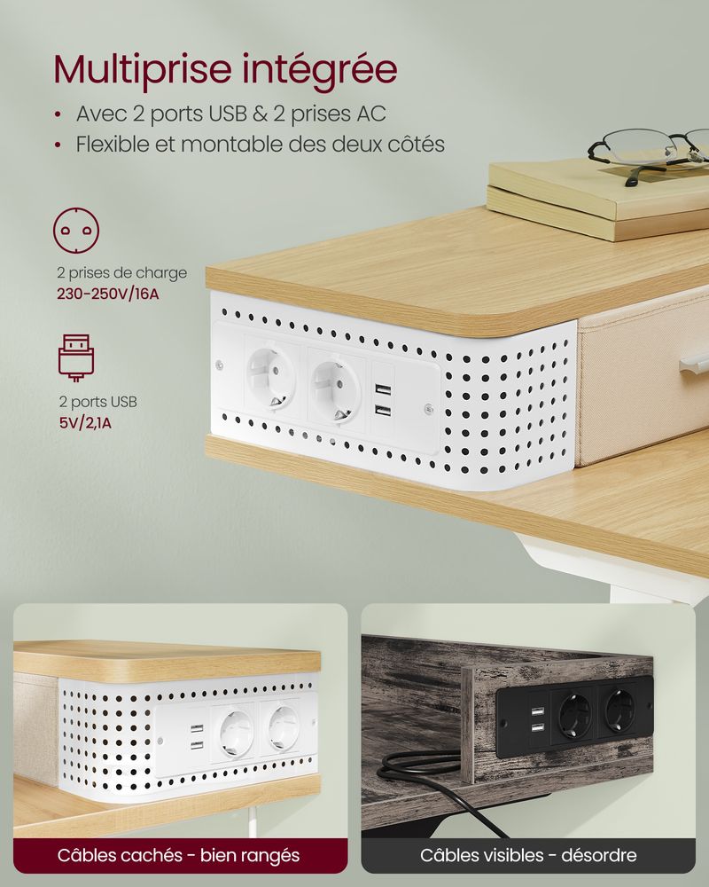Transformez votre bureau avec cet innovant bureau réglable électriquement, conçu pour améliorer votre confort et votre productivité. Son design moderne et ses fonctionnalités pratiques en font un choix idéal pour le travail comme pour le gaming. Grâce à une prise et un port USB intégrés sur le côté, rechargez facilement vos appareils. De plus, ses deux tiroirs intégrés permettent de garder un espace de travail organisé et épuré.