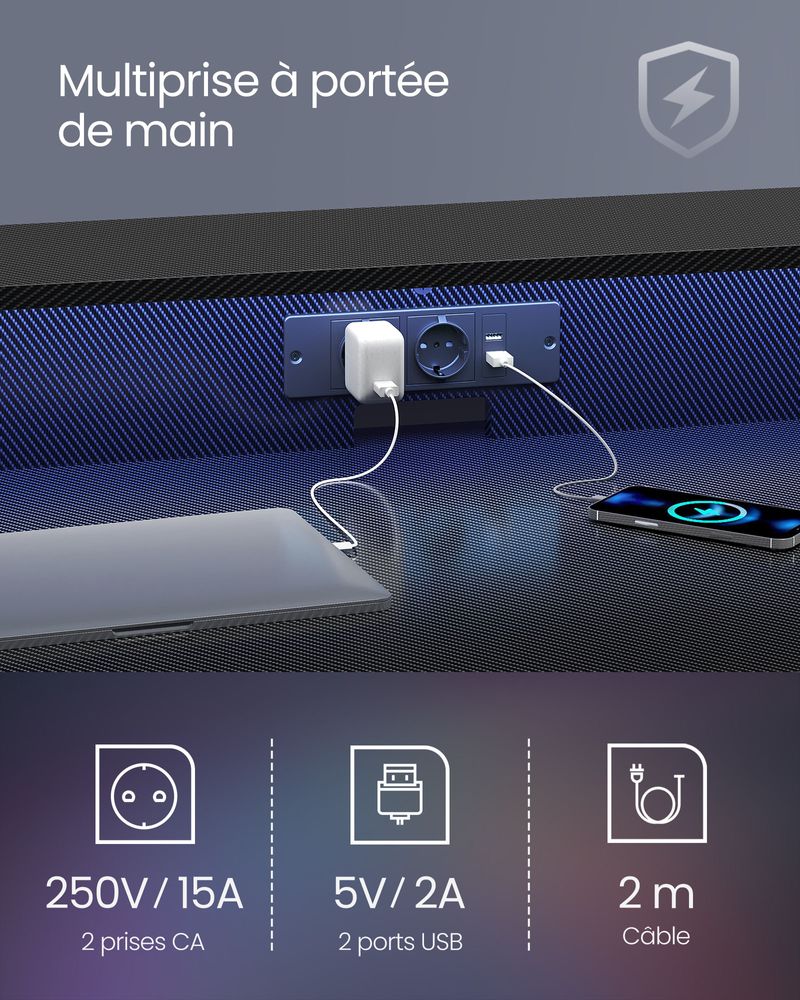 Ce bureau est équipé de 2 prises électriques et 2 ports USB, vous permettant de charger plusieurs appareils simultanément. Plongez dans votre univers gaming sans interruption ni souci de batterie.