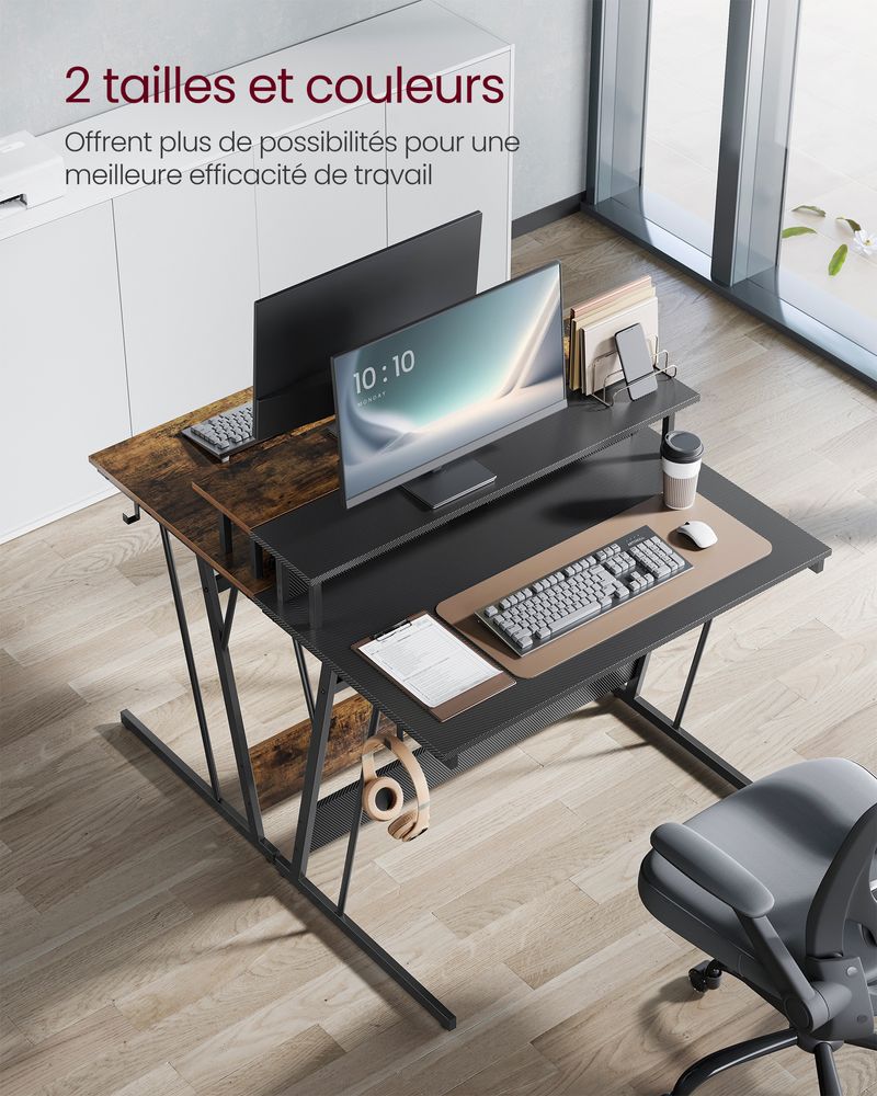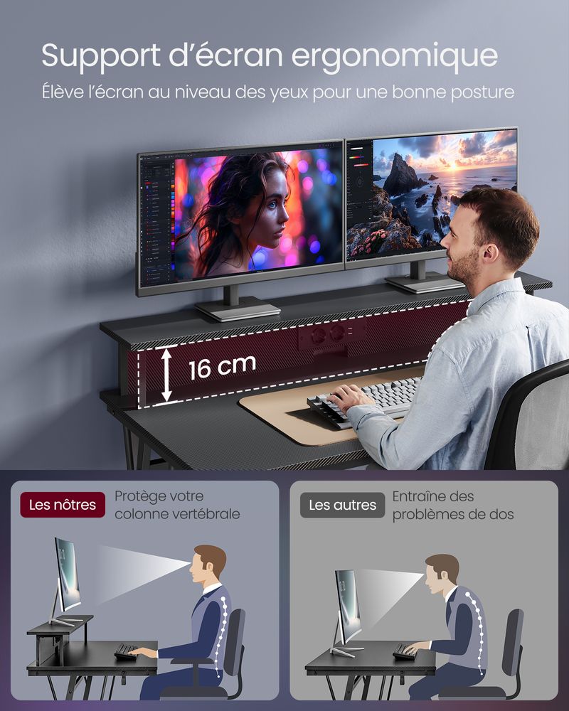 Le support intégré permet de placer deux écrans à hauteur des yeux, réduisant la tension sur votre cou et votre dos. L’espace sous le support offre également un rangement supplémentaire pour garder votre bureau organisé.