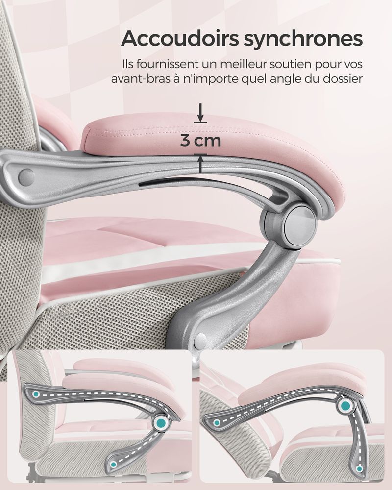 Dotée d’un cadre en métal robuste et d’un mécanisme de réglage en hauteur, cette chaise s’adapte facilement à votre position idéale. Sa base pivotante à 360° et ses roulettes fluides offrent une mobilité maximale pour une expérience sans contrainte.