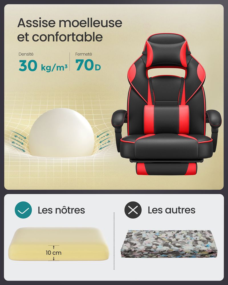 Profitez d’une assise moelleuse grâce à son design ergonomique, équipé d’un repose-pieds ajustable pour un confort optimal. Son revêtement en maille respirante assure une excellente circulation de l’air, tandis que l’appui-tête réglable et le support lombaire soutiennent parfaitement votre dos lors de longues sessions de jeu ou de travail.