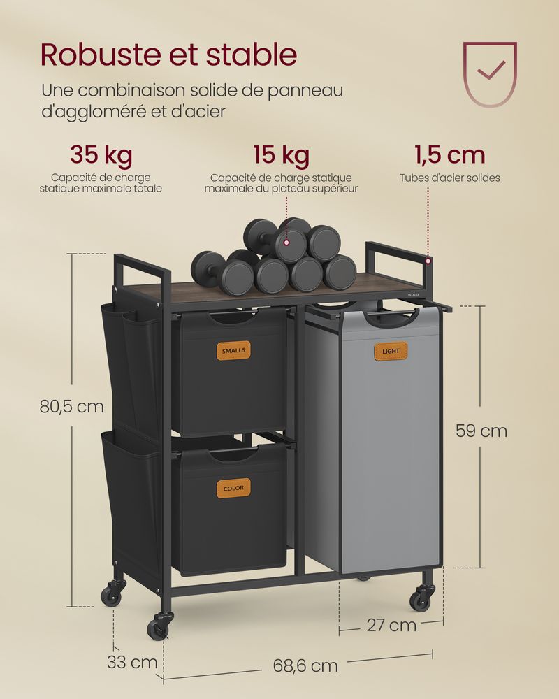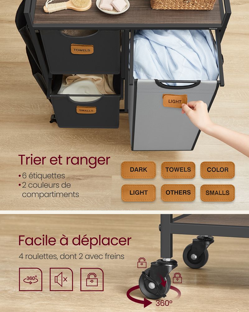 Avec ce chariot pratique, vous avez tout à portée de main et le tri du linge devient un jeu d’enfant !