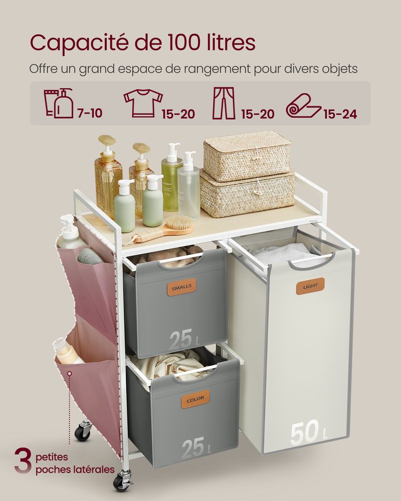 ✅ Spacieux mais compact : Ce chariot comprend deux paniers de 25 litres et un grand panier de 50 litres, offrant une capacité totale de 100 litres. La tablette supérieure permet de ranger les lessives et accessoires, tandis que les poches latérales accueillent de petits objets.