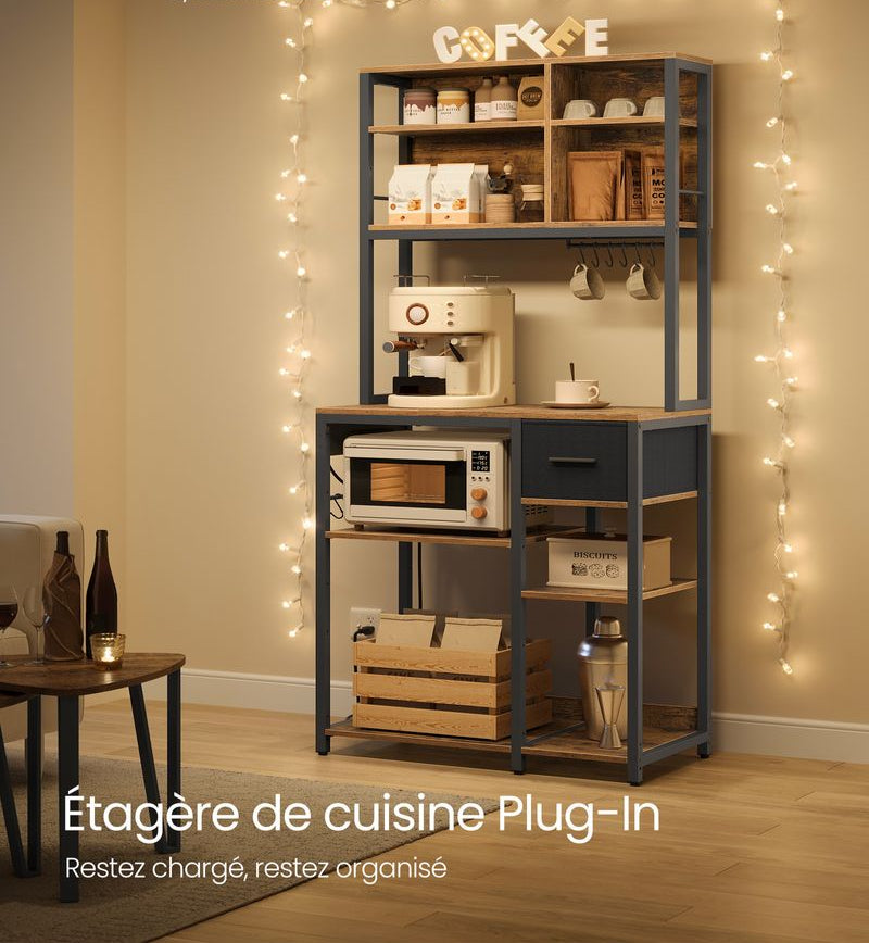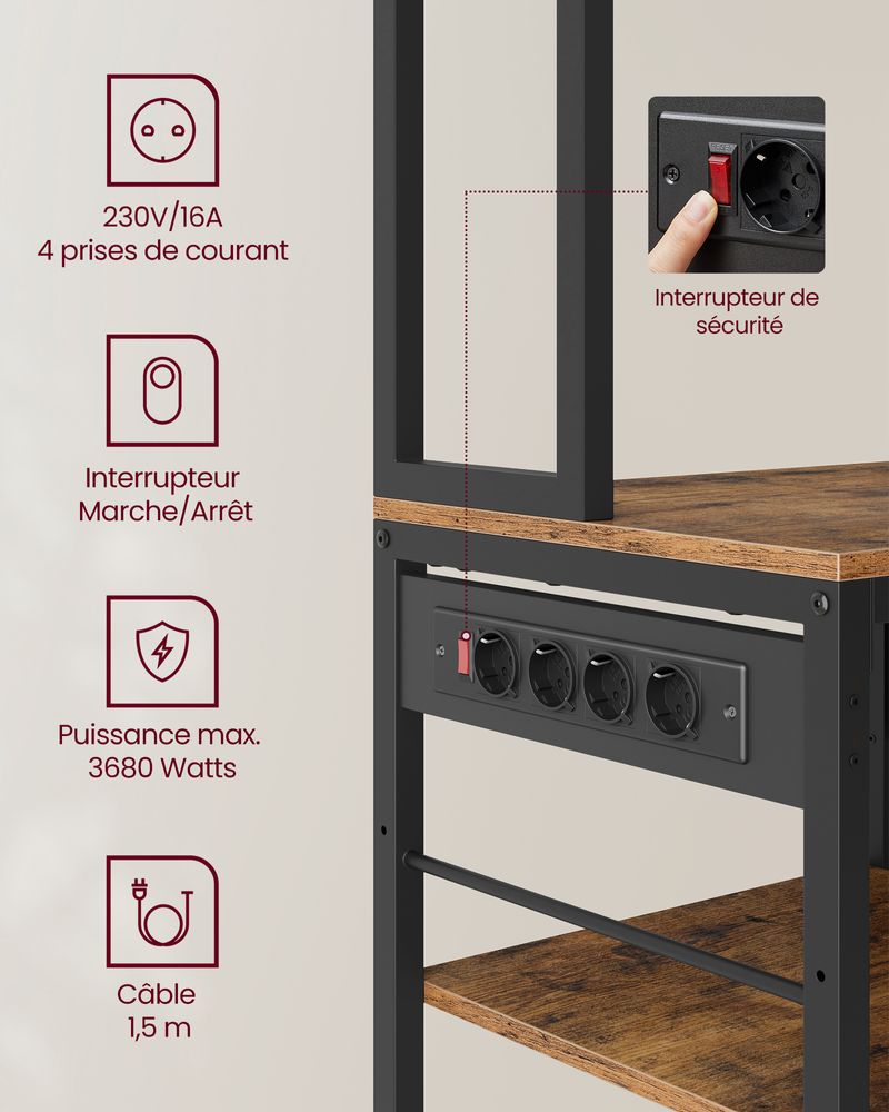Ce meuble de cuisine debout offre un espace de travail supplémentaire et des possibilités de rangement avec une prise multiple intégrée et plusieurs options de stockage. Il constitue la solution parfaite pour une cuisine bien organisée et fonctionnelle.