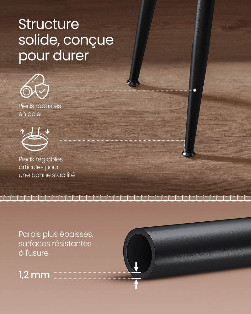 - Capacité de charge : Jusqu’à 110 kg par chaise