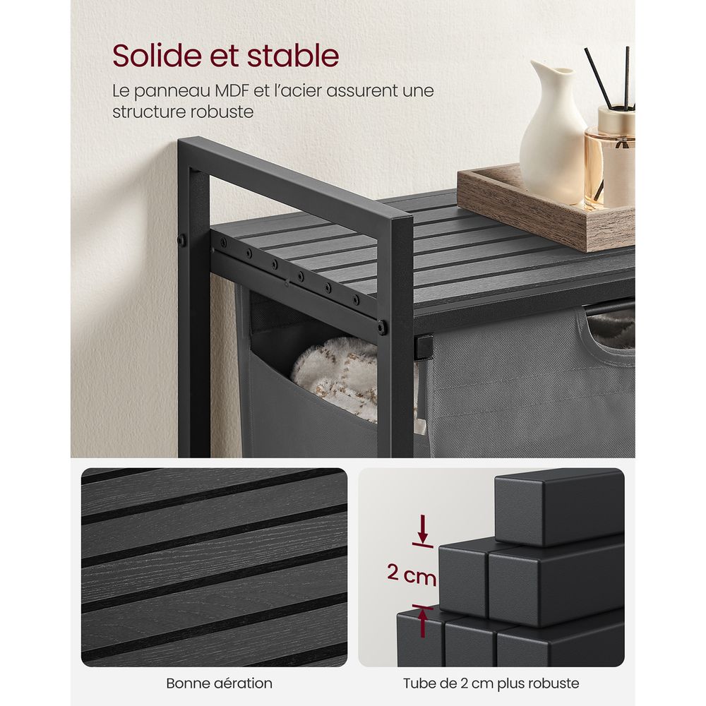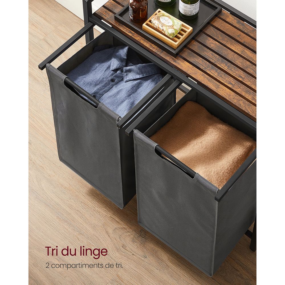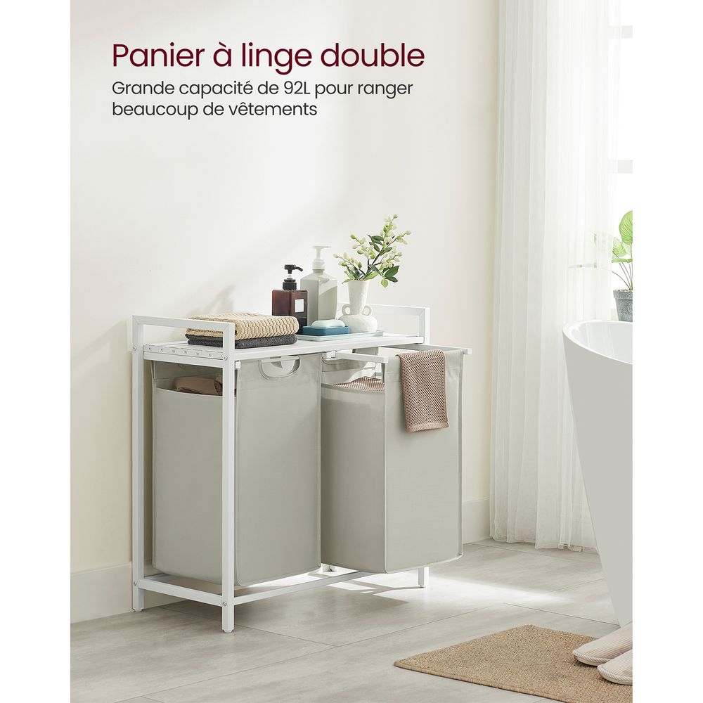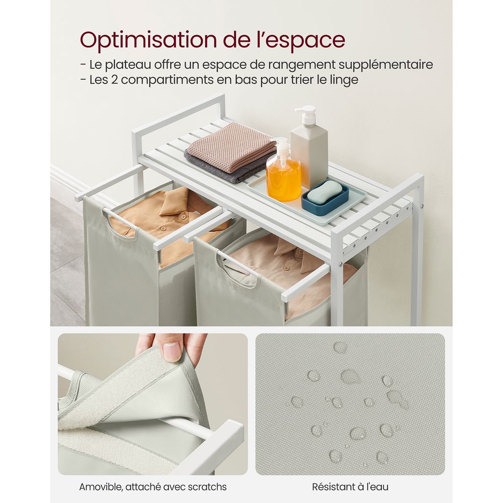 Grâce à ses deux sacs amovibles, vous pouvez trier votre linge facilement avant le lavage. Sa grande capacité le rend idéal pour les vêtements, les serviettes et le linge de lit, garantissant un espace toujours bien organisé.