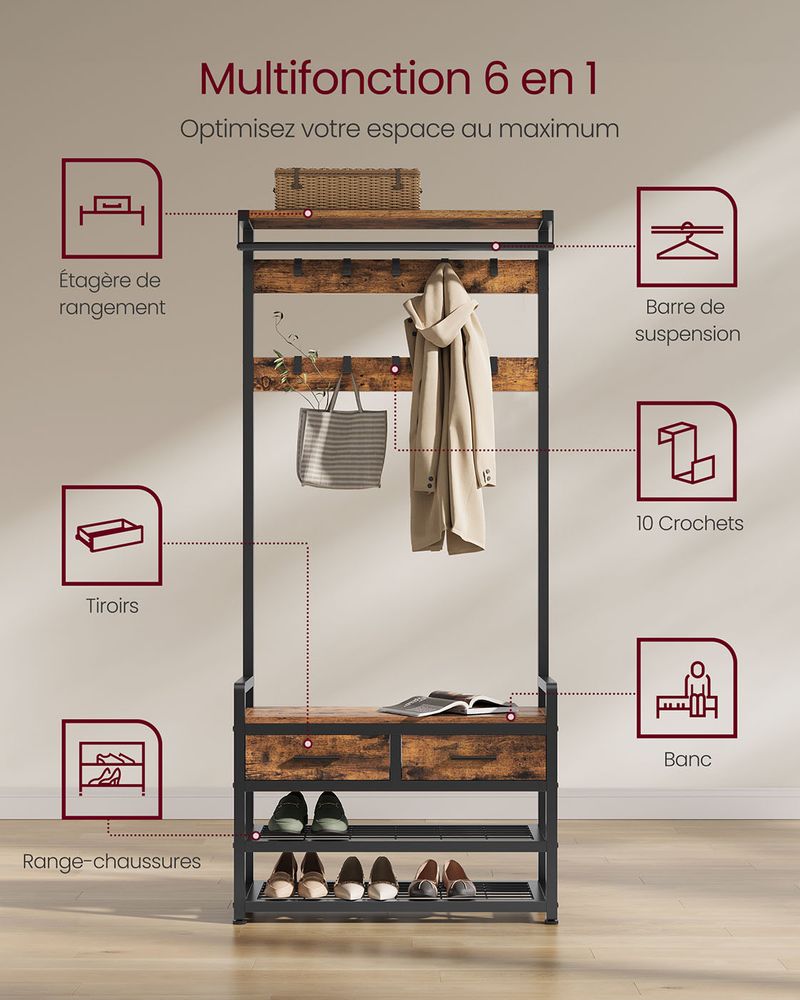 ✔ Design 6-en-1 : porte-manteau, rack à chaussures, banc, tiroirs, tringle à vêtements et étagère