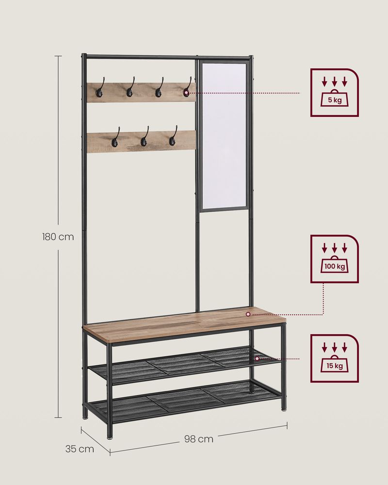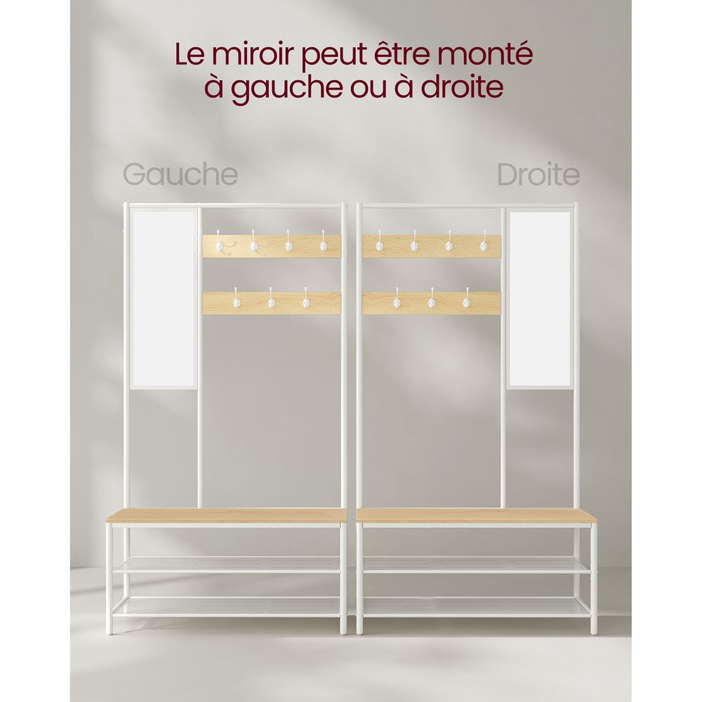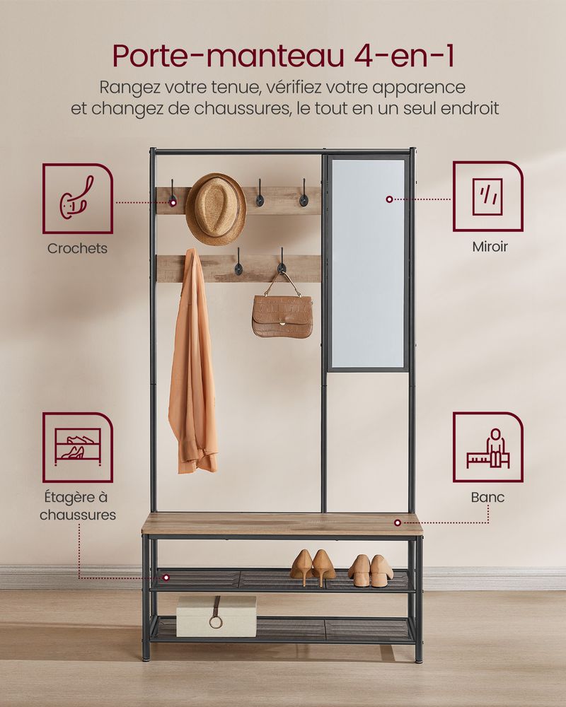 ✔ Design 4-en-1 : portemanteau, banc, miroir et rangement chaussures