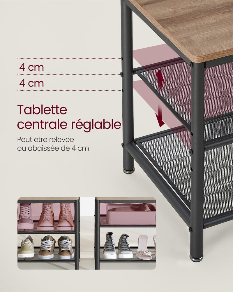 L’étagère centrale est réglable en hauteur et s’adapte à tous types de chaussures : chaussons, baskets, escarpins ou bottes.