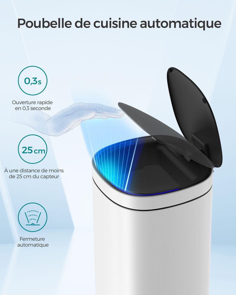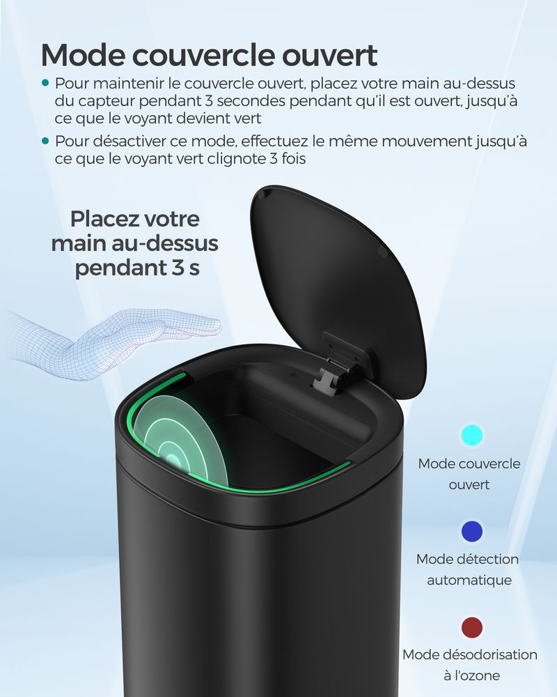 Fonctionnement sans contact : En passant la main à moins de 25 cm au-dessus du capteur, le couvercle s'ouvre automatiquement en 0,3 seconde. Après 5 secondes, le couvercle se ferme tout seul.