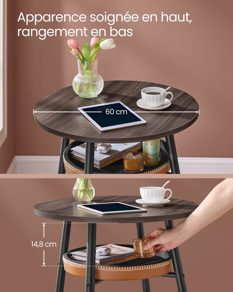 Tiroir pratique : Le compartiment de rangement intégré (40 cm de diamètre, 2,8 cm de profondeur) sous le plateau est parfait pour de petits objets.