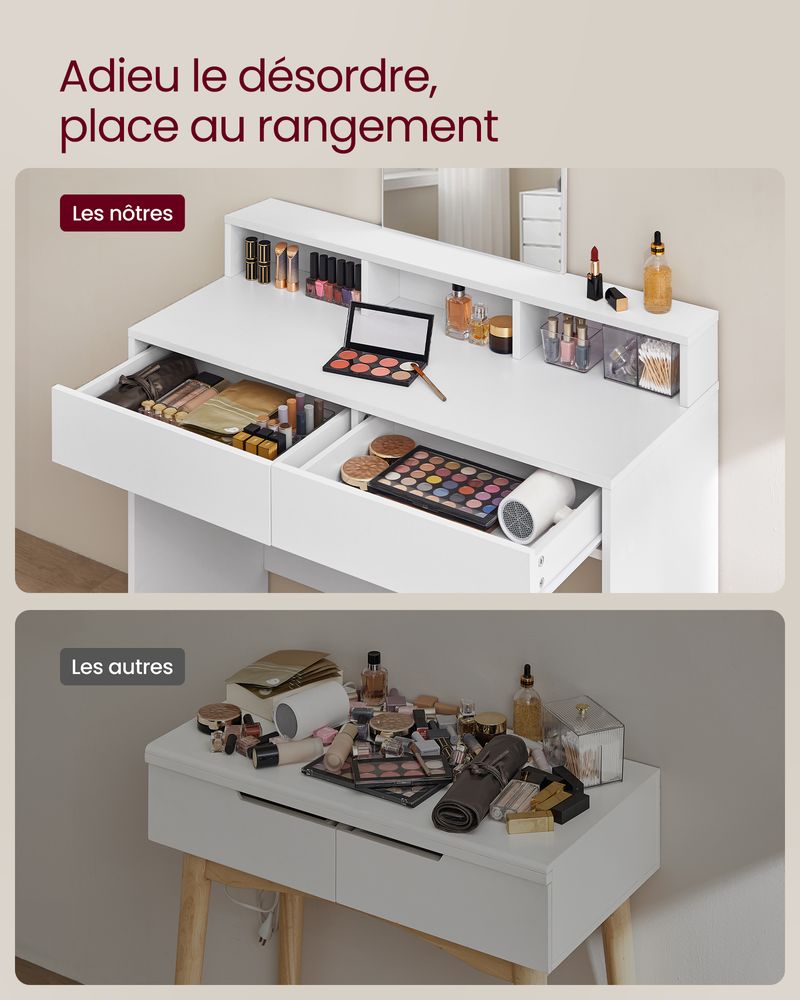 Dotée d'un large plateau et d'un grand miroir, cette table vous offre un espace de maquillage idéal. Ses tiroirs permettent de ranger vos cosmétiques, bijoux et accessoires pour une organisation parfaite.