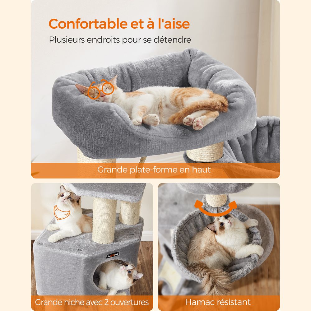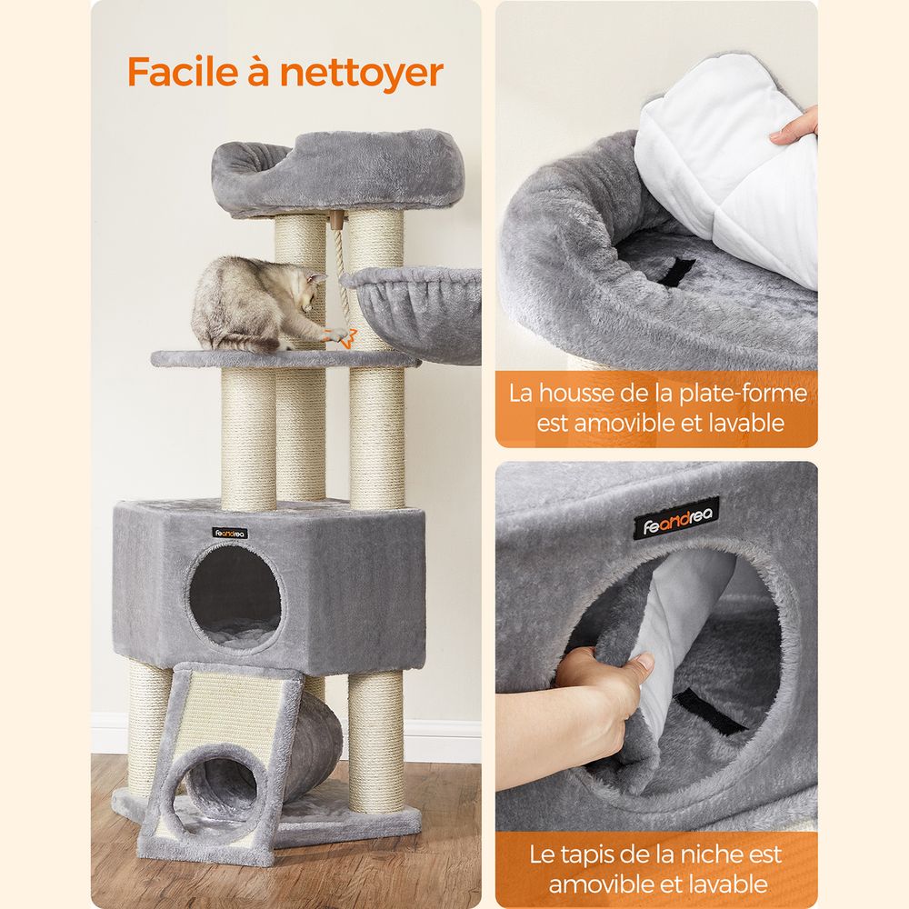 Cet arbre à chat spacieux est un véritable havre de paix pour votre félin. Avec sa plateforme d’observation douce, sa cabane spacieuse et son panier confortable, il offre un espace idéal pour le repos et le jeu.