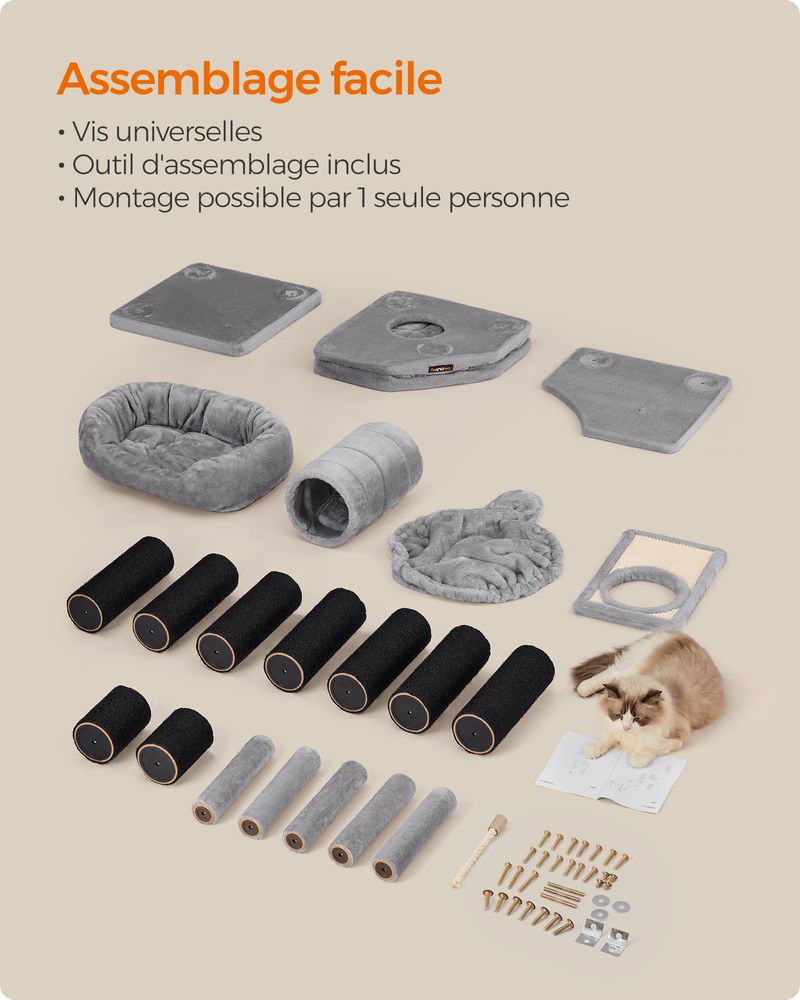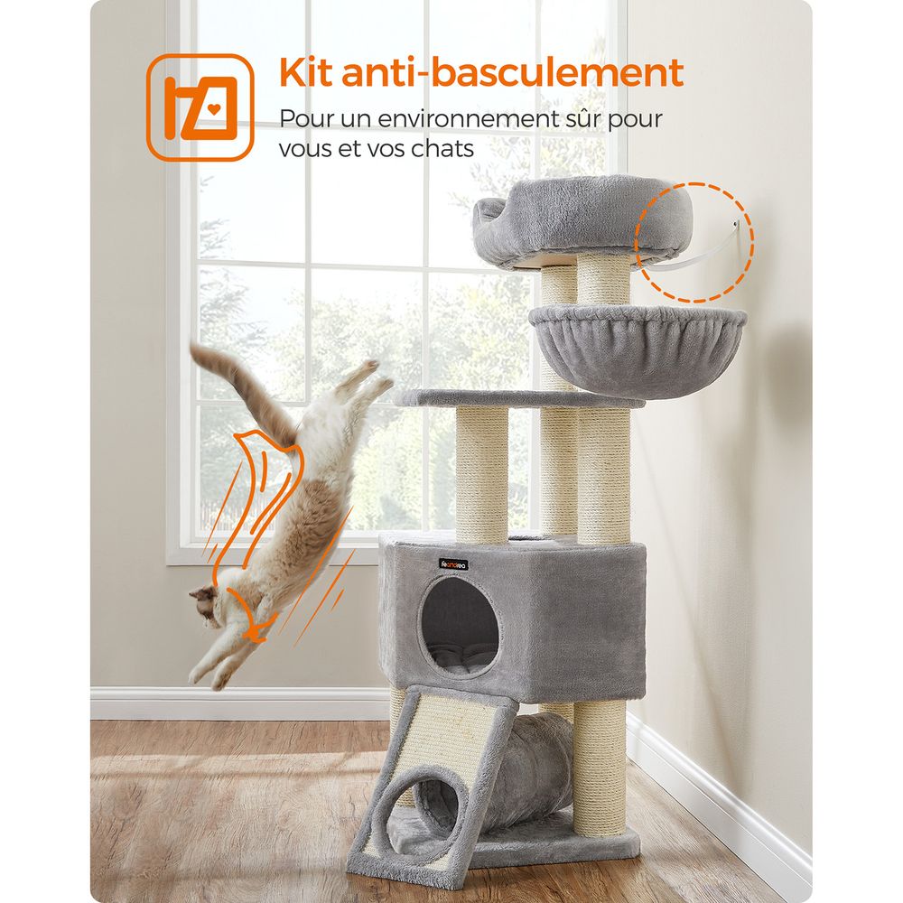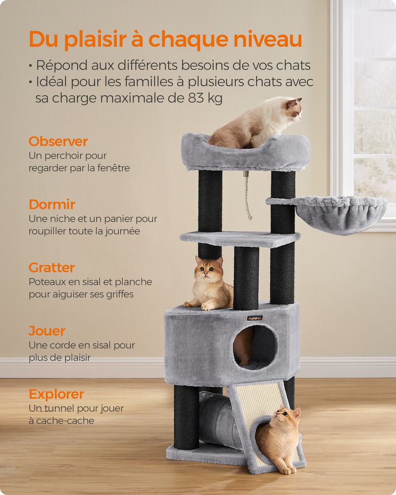En plus des espaces de repos en hauteur, la base comprend une zone de jeu avec un tunnel et une planche à griffer, parfaite pour que votre chat puisse dépenser son énergie.