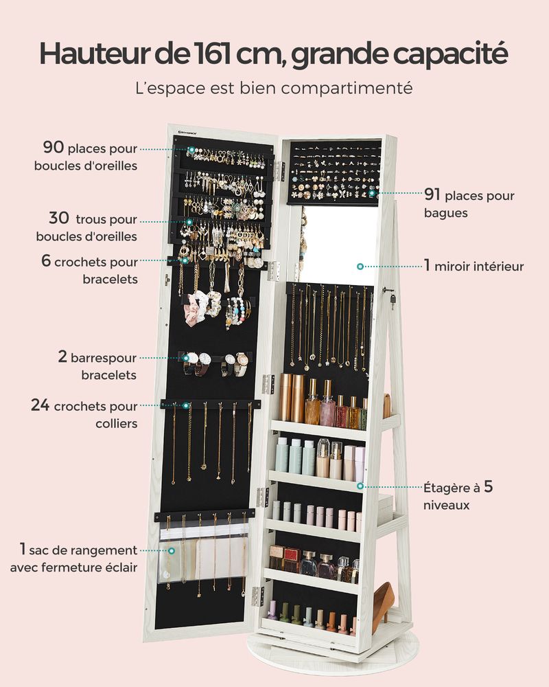 Espace de rangement optimisé : 90 crochets pour boucles d'oreilles, 30 emplacements pour clous, 30 crochets pour colliers, 91 porte-bagues, 5 étagères et 1 compartiment en plastique.