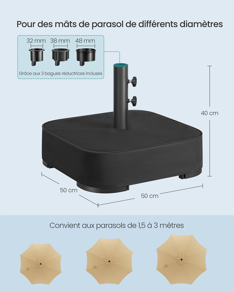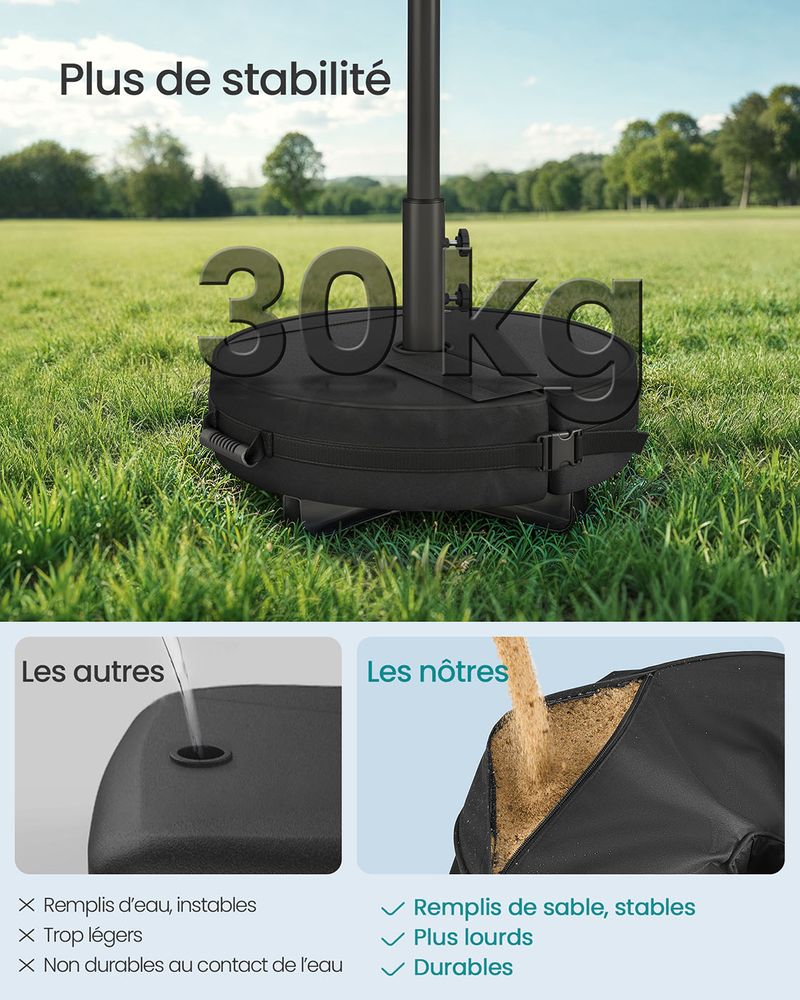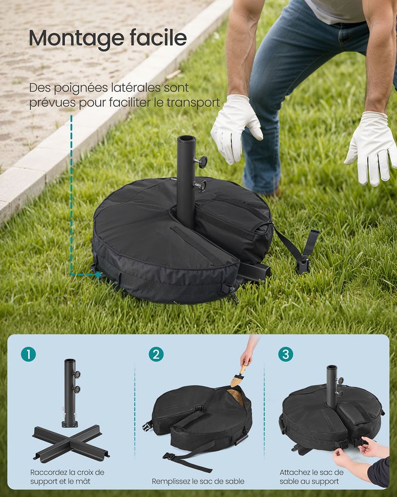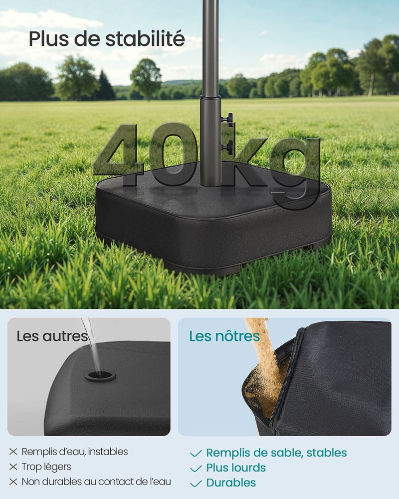 📌 Conseil : Remplissez le sac avec du sable sec pour une meilleure stabilité. Ne convient pas aux parasols avec mât déporté.